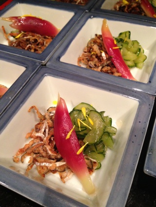 鱧皮と胡瓜の酢の物です。暑いときはさっぱり酢の物が美味いです。彩に酢取り茗荷を添えてます。